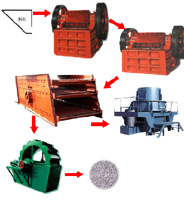 沙石生產(chǎn)線,砂石生產(chǎn)線,砂石生產(chǎn)線設(shè)備,砂石線,砂石生產(chǎn)設(shè)備基本流程:大塊石料經(jīng)料倉由振動給料機均勻地送進鄂式破碎機進行粗碎,粗碎后的石料由皮帶輸送機送到反擊式破碎機進行進一步破碎;不滿足粒度要求的石子由皮帶輸送機返料送到反擊式破碎機進行再次破碎,形成閉路多次循環(huán)。細(xì)碎后的石料由皮帶輸送機送進振動篩進行篩分,篩分出幾種不同規(guī)格的石子,滿足粒度要求的石子由成品皮帶輸送機送往成品料堆;成品粒度可按照用戶的需求進行組合和分級,為保護環(huán)境,可配備輔助的除塵設(shè)備。