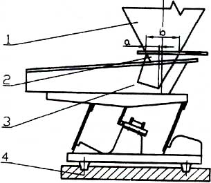 電磁振動給料機的振幅和給料量受料倉倉壓影響較大,設(shè)計料倉時應盡量減少倉壓,使溜咀后側(cè)板承受一定的倉壓,并設(shè)置斜溜沮及下料閘門。如圖,一般a=1/4b。溜咀四周應與給料槽留有一定的間隙,一般5~10mm,以免產(chǎn)生噪音及影響振動。